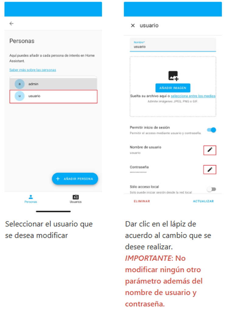 A continuación pordrás consultar la guía para poder realizar cambios de nombres de usuarios, contraseñas y eliminar usuarios en Home Assistant.